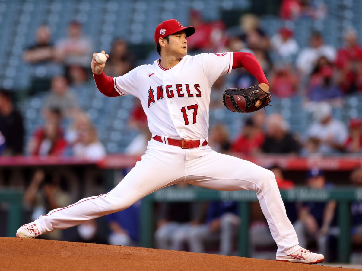 Ohtani pitching for the LA Angels at Angel Stadium on Opening Day (Ronald Martinez/Getty Images)